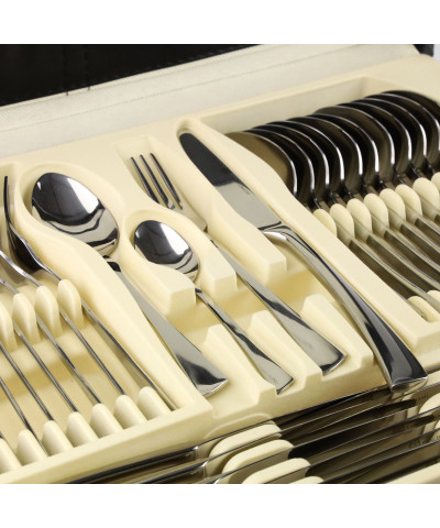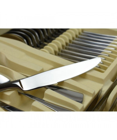 Ten 12 osobowy zestaw sztućców charakteryzuje się kwadratowym, ściętym pod skosem zakończeniem i gładką rączką, bez zdobień, co sprawia, że wyglądają bardzo elegancko. Znajdziemy w nim wszystko, co potrzeba by każdy posiłek był wyjątkowy. Sprawdzą się do użytku zarówno w domowym zaciszu jak i podczas imprez w gronie rodziny i przyjaciół.