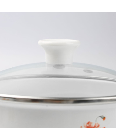 Komplet garnków MAKI to klasyczne naczynia do gotowania pokryte emalią. W skład kompletu wchodzą 3 garnki o różnych pojemnościach, każdy z dopasowaną do niego pokrywą. W kolorze białym, z dwóch boków zdobione motywem maków. Garnki wykonane zostały z lekkiej a zarazem wytrzymałej stali węglowej oraz dwustronnie pokryte emaliowaną powłoką. Rant zabezpieczony nierdzewną obręczą.