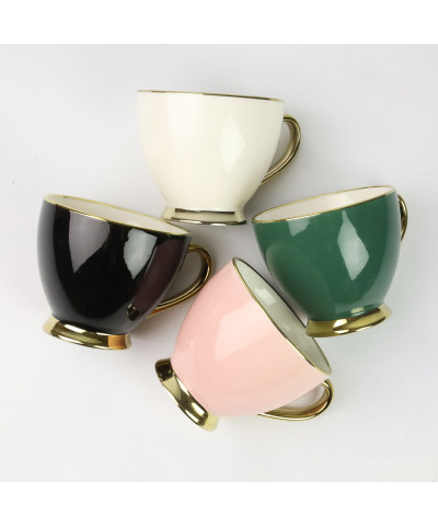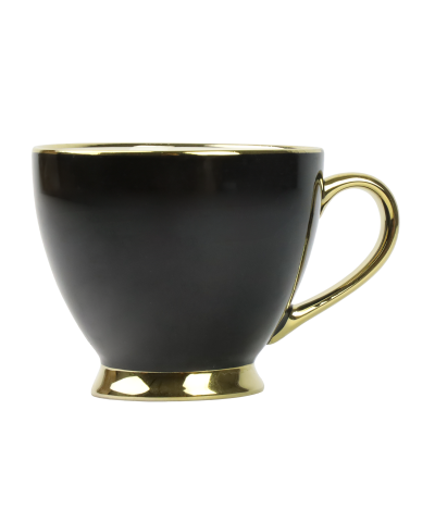 Kubek wykonany został z wysokiej jakości porcelany, która jest bardzo trwała i higieniczna a gładka powierzchnia nie zatrzymuje zanieczyszczeń i mikroorganizmów, co ułatwia mycie. Ma kształt dużej, zaokrąglonej filiżanki zakończonej niską stopką, co dodaje mu gracji i uroku. Z zewnątrz pokryty lakierem w kolorze czarnym która doskonale współgra ze złotym zdobieniem ucha, stopki i rantu.