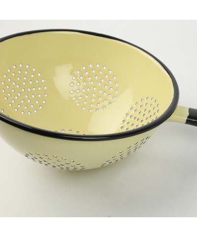 Durszlak cedzak emaliowany o średnicy 20 cm i jest praktycznym narzędziem kuchennym. Wykonany z metalu pokrytego warstwą emalii w jasnym kremowym kolorze, charakteryzuje się wytrzymałością i odpornością na korozję. Jego klasyczny design uzupełnia długą rączkę w ciemnym kolorze, co ułatwia użytkowanie i trzymanie podczas odcedzania potraw. Durszlak ma wiele drobnych otworów rozmieszczonych równomiernie na dnie i bokach, które umożliwiają szybkie odsączanie wody z makaronów, warzyw lub innych składników.