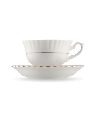 Filiżanka z tej kolekcji wykonana została z najwyższej jakości białej porcelany, wykończony złotymi zdobieniami w formie pasków. Charakterystyczną cechą tego wzoru jest falowana powierzchnia w górnej części naczynia. Śnieżna biel oraz subtelne złote dodatki wpasują się idealnie w wystrój każdego stołu.