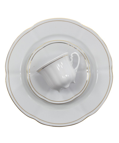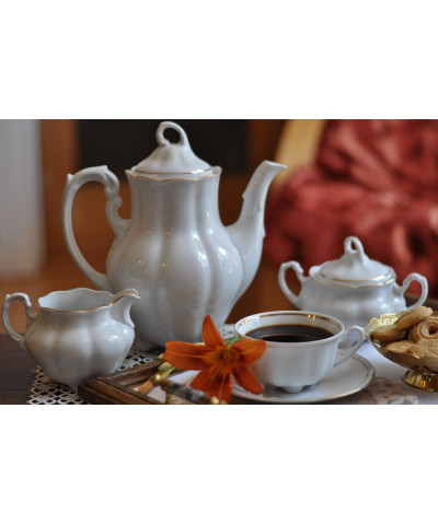Wprowadź do swojego domu nutę klasycznej elegancji z wyjątkowym serwisem do kawy/ herbaty Bolero Złota Linia, stworzonym z wysokogatunkowej porcelany i zdobionym delikatną złotą dekoracją. Subtelne linie, szlachetna biel porcelany oraz precyzyjne wykończenie sprawiają, że zestaw ten znakomicie sprawdzi się zarówno podczas codziennych spotkań przy herbacie, jak i w czasie bardziej uroczystych okazji.