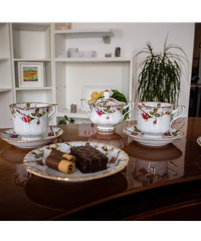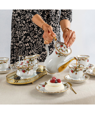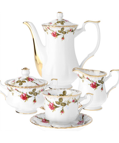 Serwis do kawy Iwona Złota Róża to kwintesencja klasycznej elegancji i ponadczasowego stylu. Wykonany z wysokiej jakości porcelany, zdobiony ręcznie nanoszonymi złotymi akcentami oraz motywem angielskiej róży, stanowi doskonały wybór dla osób ceniących tradycyjne wzornictwo i luksusowe detale.
