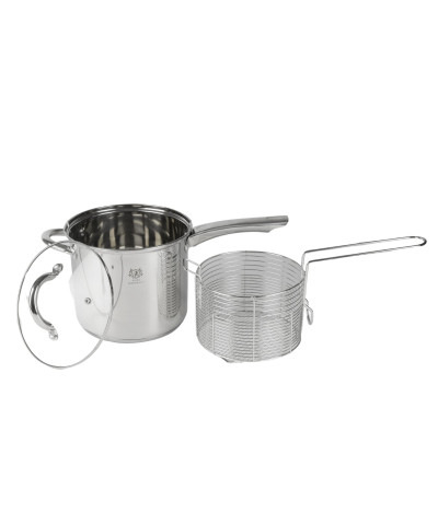 Garnek do frytek o średnicy 18 cm wykonany z trwałej stali nierdzewnej, wyposażony w praktyczne sitko, idealnie sprawdza się do smażenia, gotowania i odcedzania na wszystkich typach kuchenek, w tym indukcyjnych.