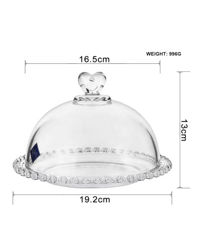 Patera z kloszem to stylowe i praktyczne naczynie, które nie tylko pięknie eksponuje ciasta, owoce czy przekąski, ale także chroni je przed zanieczyszczeniami i pomaga dłużej zachować ich świeżość. Wypukłe serduszka na krawędzi oraz serduszko-uchwyt na szczycie klosza dodają całości wyjątkowego uroku.