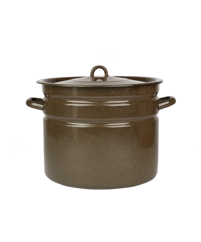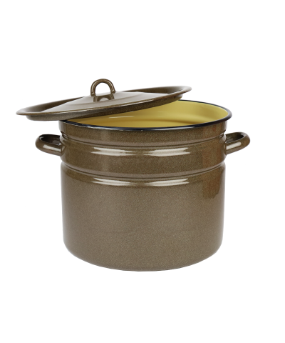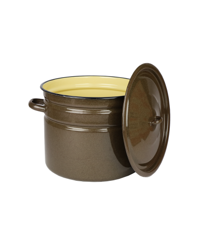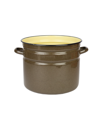 Garnek emaliowany o pojemności 20L to połączenie prostego, tradycyjnego kształtu z uwielbianą przez wielu emalią. Jest w kolorze brązowym, a wewnątrz zdobi go kolor pastelowo żółty. Wykonany został z wysokiej jakości stali oraz dwustronnie pokryty emaliowaną powłoką.